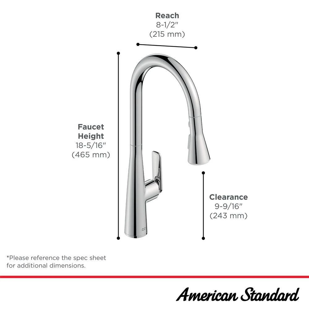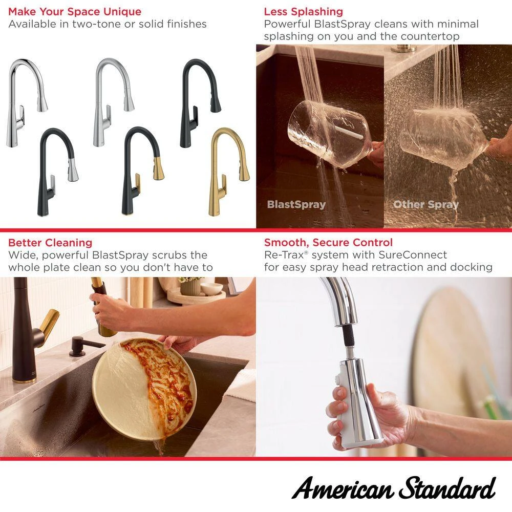 The Aspirations Pull-Down Kitchen Faucet from American Standard sets the tone for today’s contemporary kitchen with its sleek style and enhanced features. Designed to handle every task with ease, the Aspirations pull-down faucet has 3 practical and useful spray patterns you’ll find indispensable: stream for filling pots, wide BlastSpray to easily clear food with no scrubbing or splashing outside the sink, and a gentle rinse spray to effectively clean delicate fruits and vegetables. Available in beautiful finishes including two-tone options to make your space unique.ue.