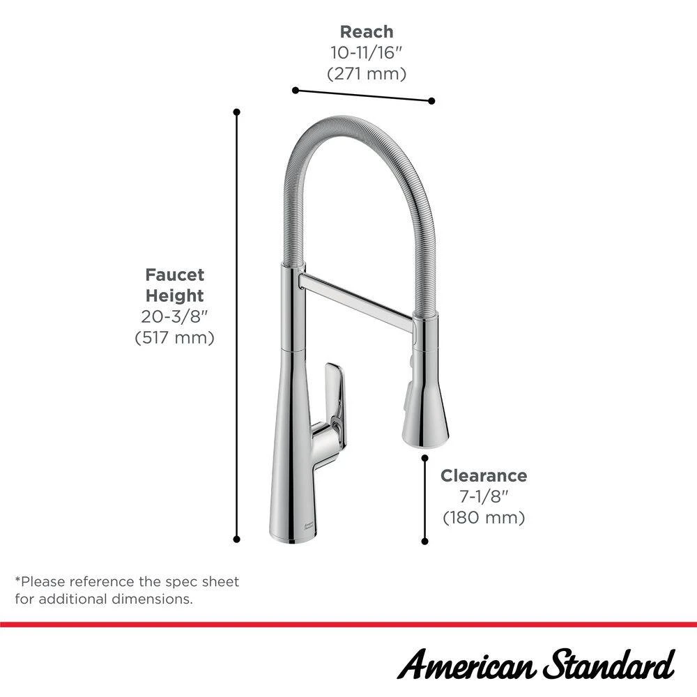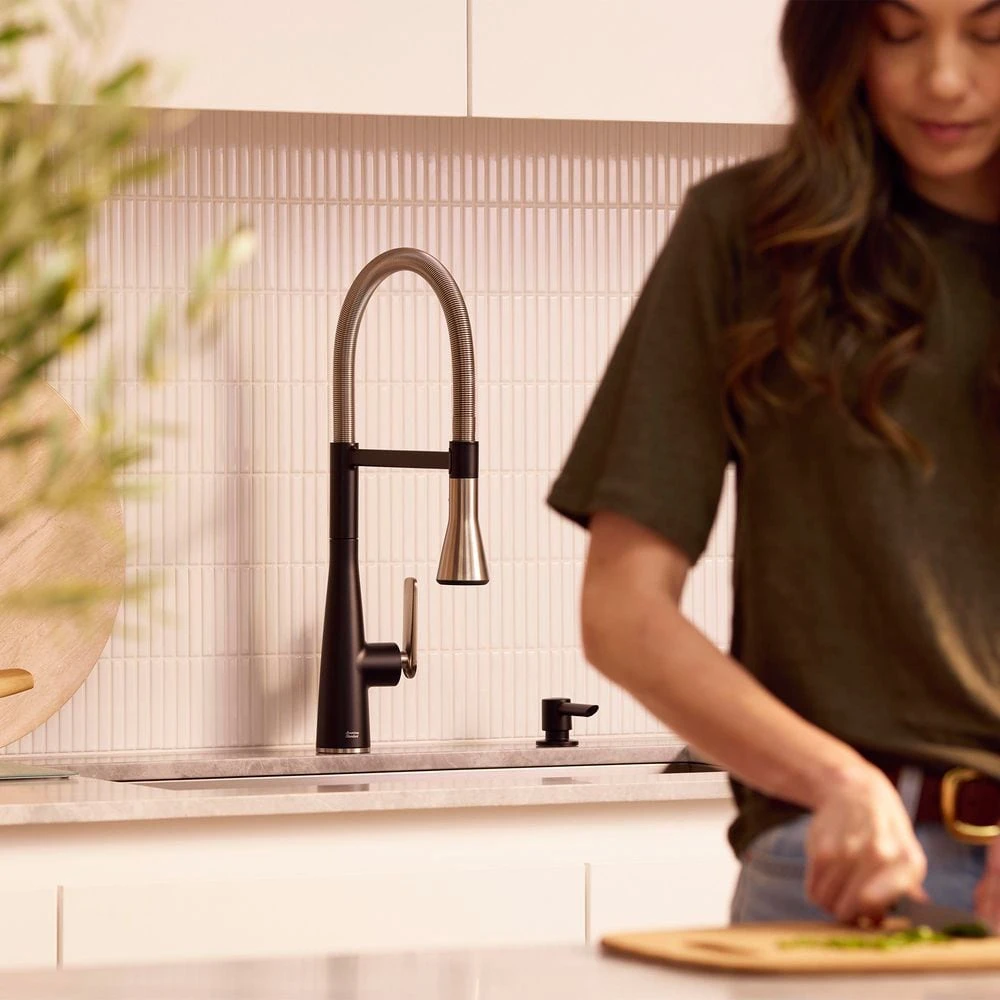 The Aspirations Semi-Pro Single-Handle Kitchen Faucet from American Standard sets the tone for today’s contemporary kitchen with its sleek, professional style and enhanced features. Designed to handle every task with ease, the Aspirations semi-pro faucet has 3 practical and useful spray patterns you’ll find indispensable: Stream for filling pots, wide Blast Spray to easily clear food with no scrubbing and minimal splashing, and a Gentle Rinse spray to effectively clean delicate fruits and vegetables. Available in beautiful finishes including 2-tone options to make your space unique.