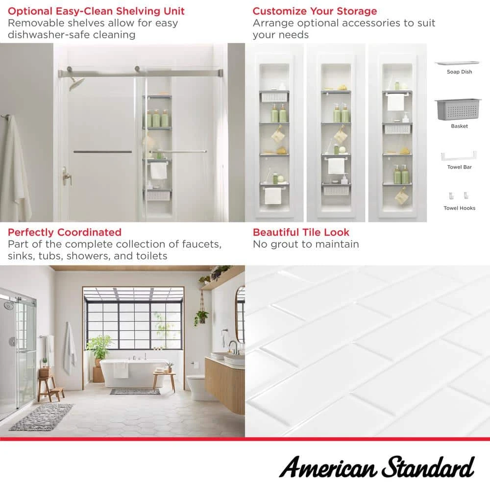 The Aspirations Glue-Up Shower Walls from American Standard elevate the bathroom with the crisp, clean look of glossy white tiles. This low-maintenance shower wall system eliminates the care and maintenance required of traditional tile grout while inhibiting the growth of mildew for easy cleaning. Premium 84 in. H is designed to reach above the showerhead for a finished look. These contemporary wall panels coordinate perfectly with the Aspirations bathroom collection.