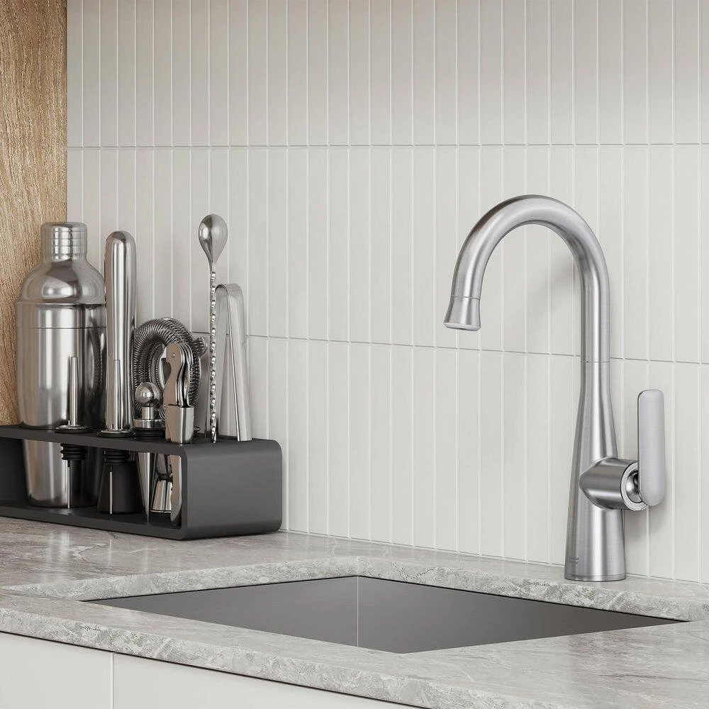 The Aspirations Pull-Down Bar Faucet from American Standard sets the tone for today’s contemporary home with its sleek style and multiple finishes. The pull-down bar faucet is the perfect size for an entertainment area wet bar. The Re-Trax system makes extension and retraction of the spray head smooth and easy, with Sure Connect grip to hold the spray head securely in place when not in use. Available in beautiful finishes including 2-tone options to make your space unique.