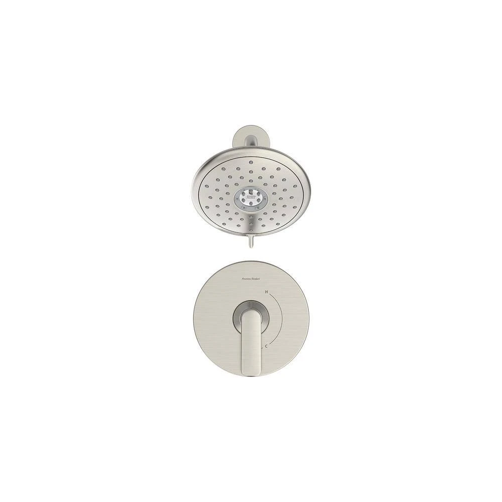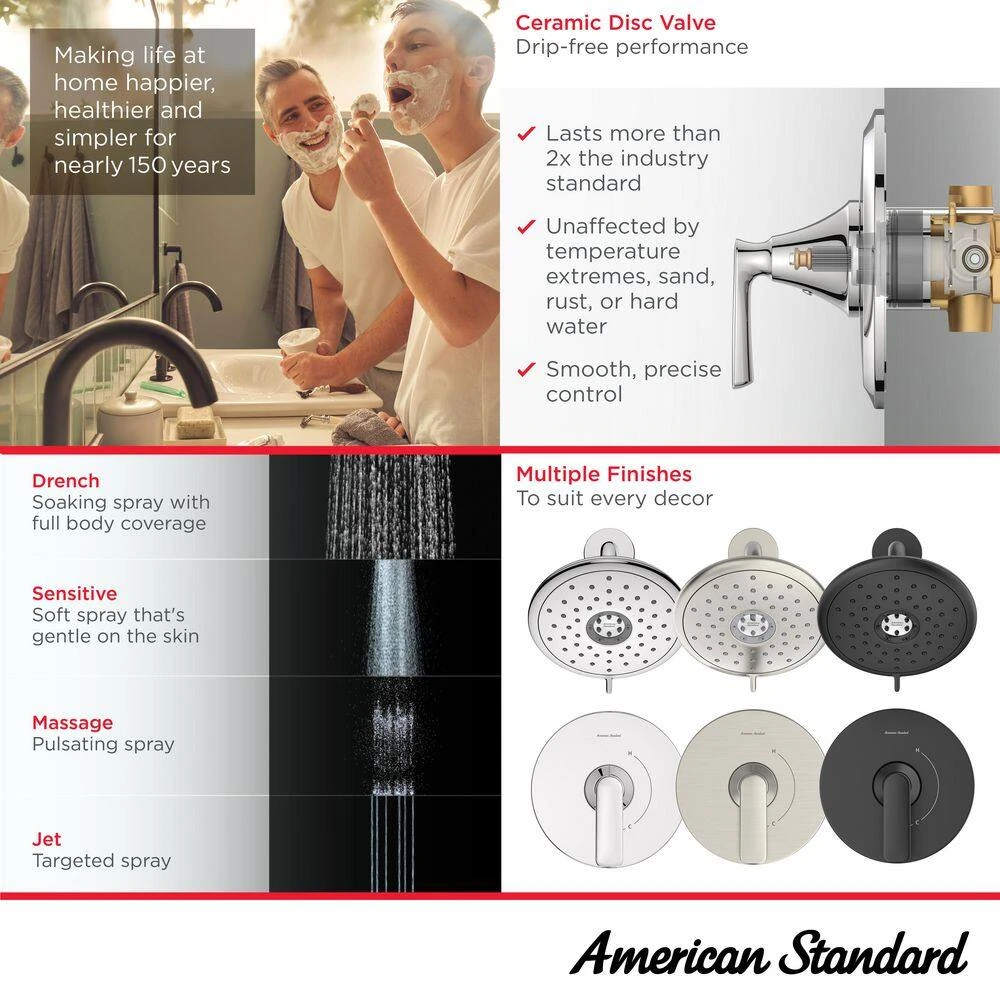 The Aspirations Shower Trim Kit from American Standard is a contemporary style designed to complement the entire Aspirations collection. It features a versatile, water-saving 4-function shower head with lever to easily alternate between sprays and technology to ensure consistent water temperature for the duration of your shower. Includes shower head and metal lever handle with 1-piece cartridge. Requires Flash Shower Rough-in Valve, sold separately.