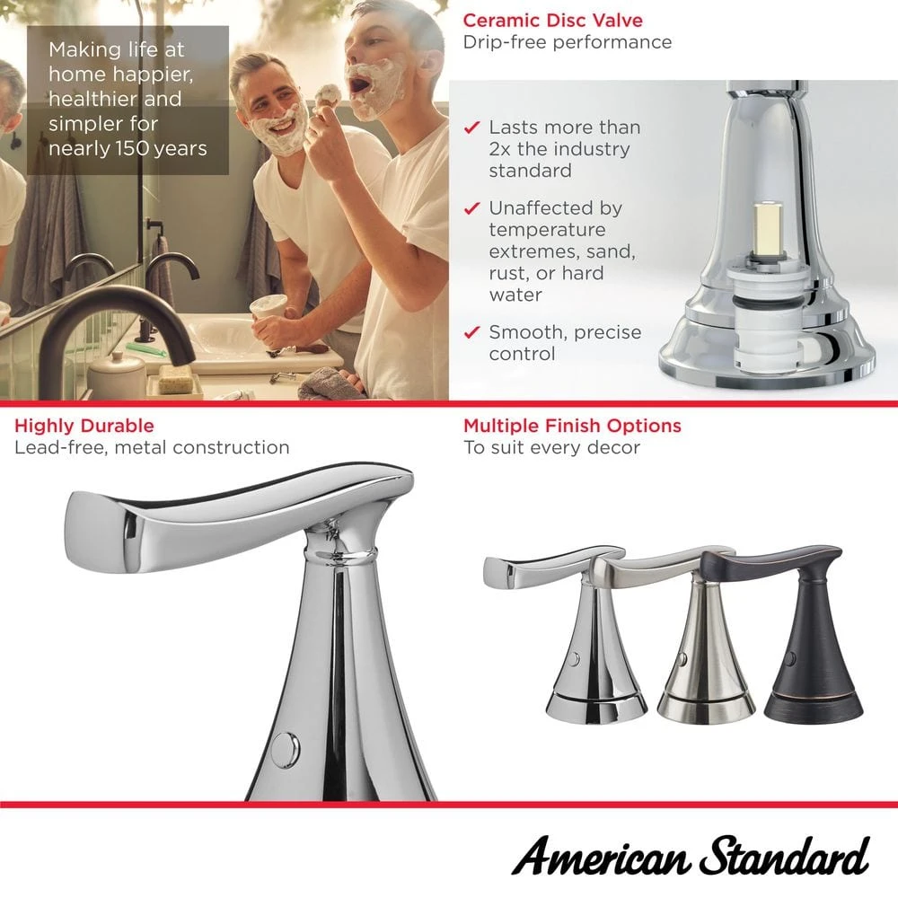 The free-flowing lines of the Chatfield Mid-Arc 2-Handle Centerset Bathroom Faucet from American Standard channel the simple beauty of nature. With a mirror-like Chrome finish, the 2 lever handles allow you to easily control water flow and temperature. Ceramic disc valve cartridges, standard on all American Standard faucets, ensure a lifetime of drip-free performance. ADA-compliant and WaterSense approved, this faucet is both inspired by nature and helping to sustain it. Available in a variety of finishes, the Chatfield collection offers a look to fit almost any bathroom decor.