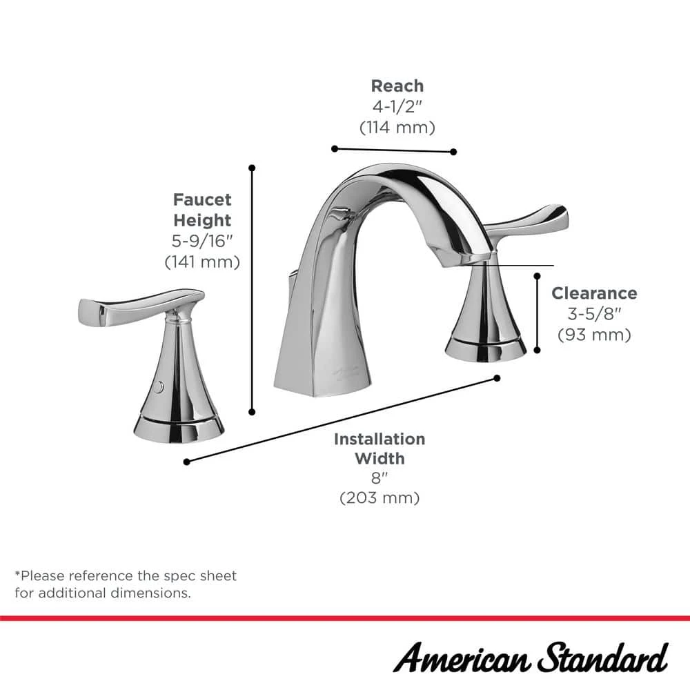 Gentle curves and sweeping lines drive the design inspiration behind the Chatfield Mid-Arc 2-Handle Widespread Bathroom Faucet from American Standard. Durable metal lever handles allow for precise volume and temperature control, and a 1.2 GPM flow rate is WaterSense certified to be easier on the environment. Faucet installation has never been easier, too, thanks to the exclusive Speed Connect system. Pre-assembled handles drop in from the top of the sink, and Speed Connect hoses easily snap together for a watertight connection. A variety of finishes and a coordinating tub and shower are also available separately to complete your bathroom upgrade.