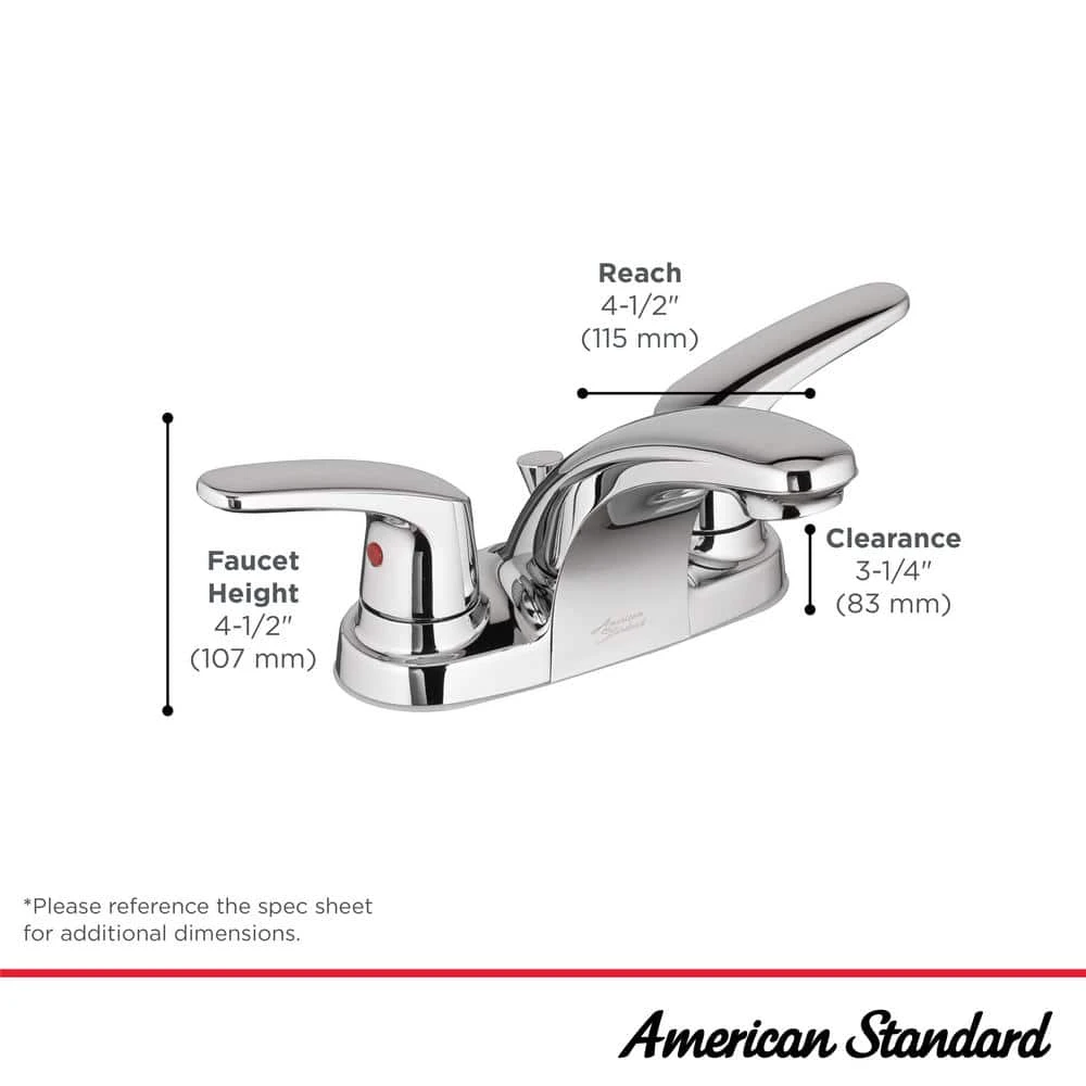 The Colony Pro Center set Bathroom Faucet from American Standard features a durable metal body and is available in three scratch-resistant finishes. Ceramic disc valve cartridges provide a lifetime of drip-free performance and Water Sense Certification will ensure you get great performance while saving water. This faucet features a fast and easy one-person installation with our innovative quick spin nuts that secure the faucet in place.
