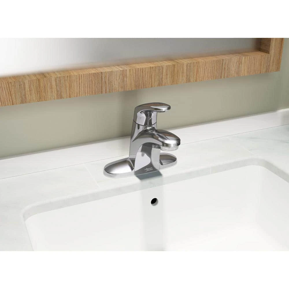 The Colony Pro single-handle centerset bathroom faucet from American Standard is a quality faucet with both style and value. A maximum flow rate of 0.5 GPM helps to save water. Memory position valving allows the user to turn the faucet on and off at a preferred temperature without making any handle adjustments, while an adjustable hot limit safety stop helps to reduce the risk of accidental scalding.