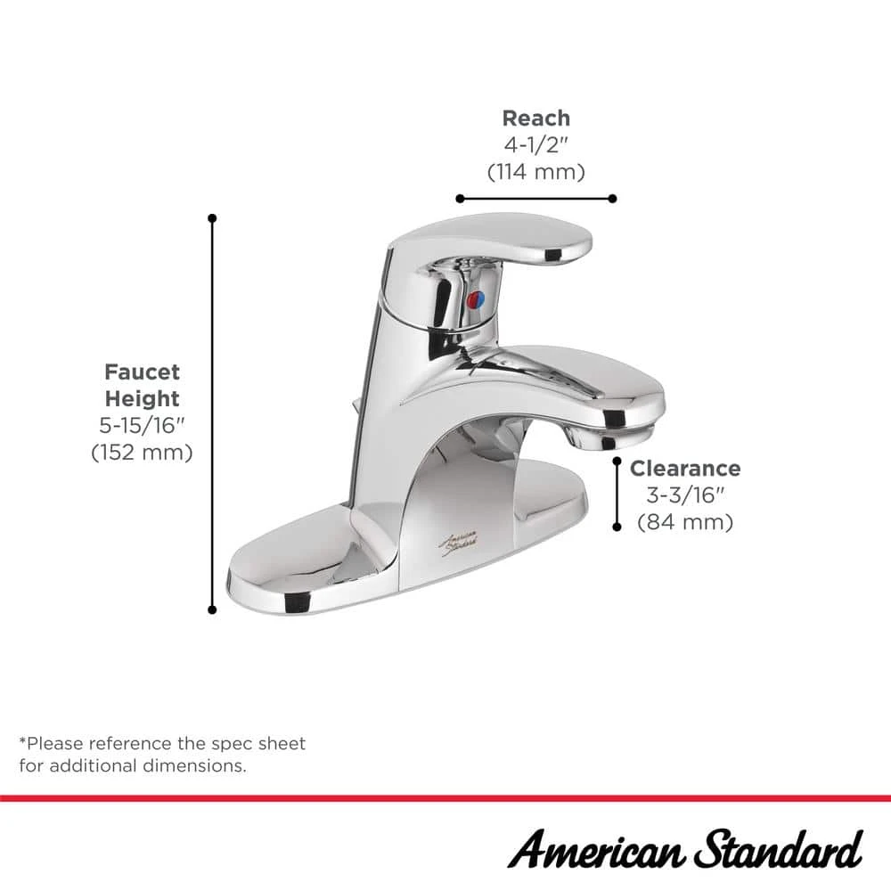 The Colony Pro single-handle center set bathroom faucet from American Standard provides excellent performance, style, and value. This single-handle faucet is Water Sense certified with a maximum flow rate of 1. 2 GPM to help save water. Memory position valving allows the user to turn the faucet on and off at a preferred temperature with no adjustments required. An innovative hot limit safety stop helps to prevent accidental scalding.