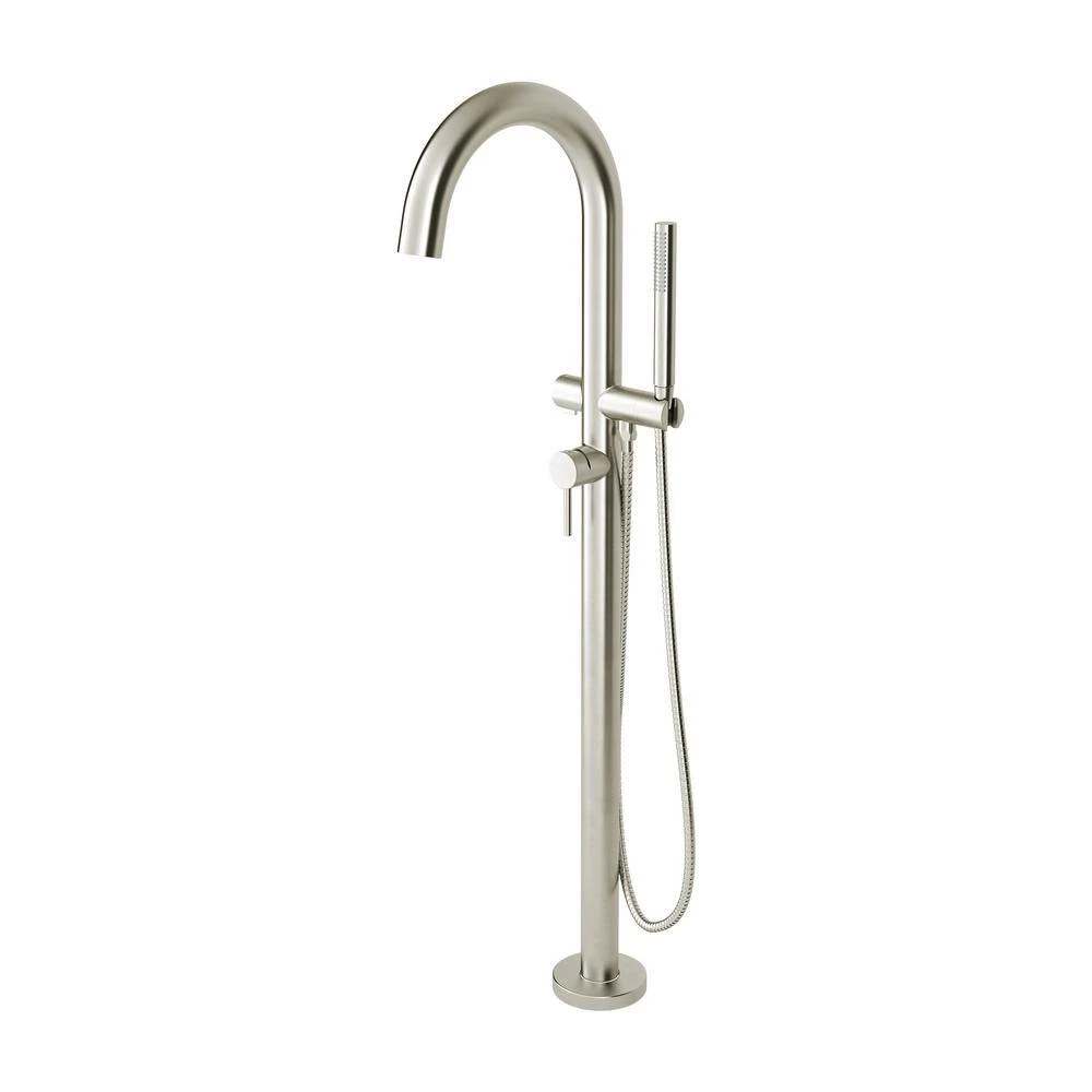 Add enduring style and superior performance to your bathroom design with the Contemporary Round Freestanding Tub Filler with Hand Shower. Combining the best of form and function, it features a minimalistic arched faucet, lever handle and sleek, personal shower for rinsing off, bathing little ones and cleaning the tub with ease. Trim and rough valve sold separately.