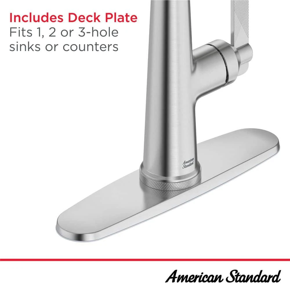 The Eastcourt Pull-Down Dual Spray Kitchen Faucet from American Standard is a distinctive style with knurling on the lever handle, spray head and tapered base to create design interest and a more secure grip. For maximum efficiency, the pull-down spray head extends smoothly to reach every corner of the sink, and offers stream and spray functions, making every kitchen task easier. Perfect for a kitchen remodel or quick update, this elegant, single-handle faucet includes a deck plate to accommodate installation on a 1, 2 or 3-hole sink or countertop.