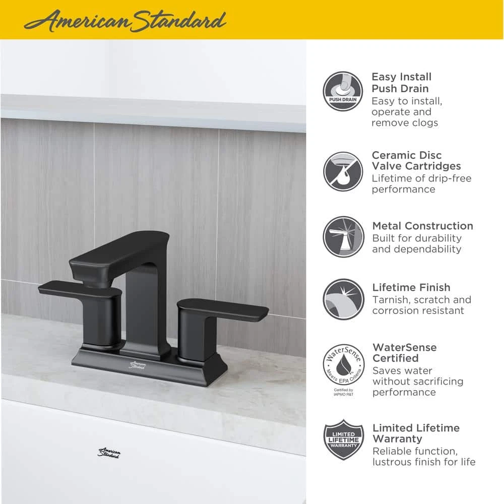 Give your bathroom an instant update with the unique style of the Forsey 2-Handle Centerset Faucet from American Standard. Its rich Art Deco influence is the perfect complement to every bathroom from traditional to modern. Designed for easy installation and maintenance-free performance featuring a convenient push drain and durable, drip-free ceramic disc valves.