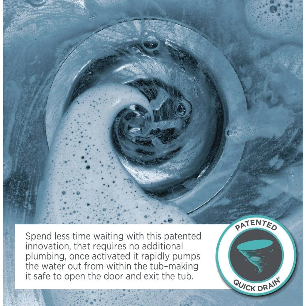 - Equipped with the quick drain system once activated it rapidly pumps the water out from within the tub, eliminating the long wait to safely open the door and exit the tub