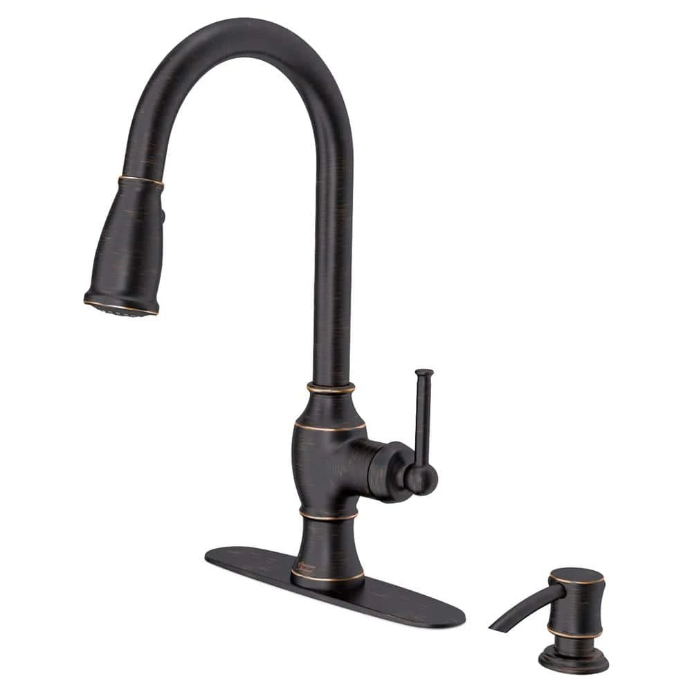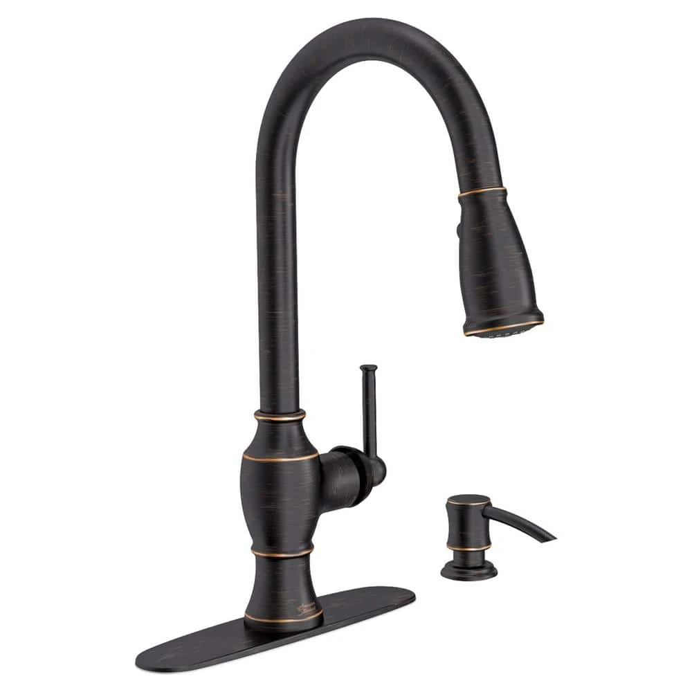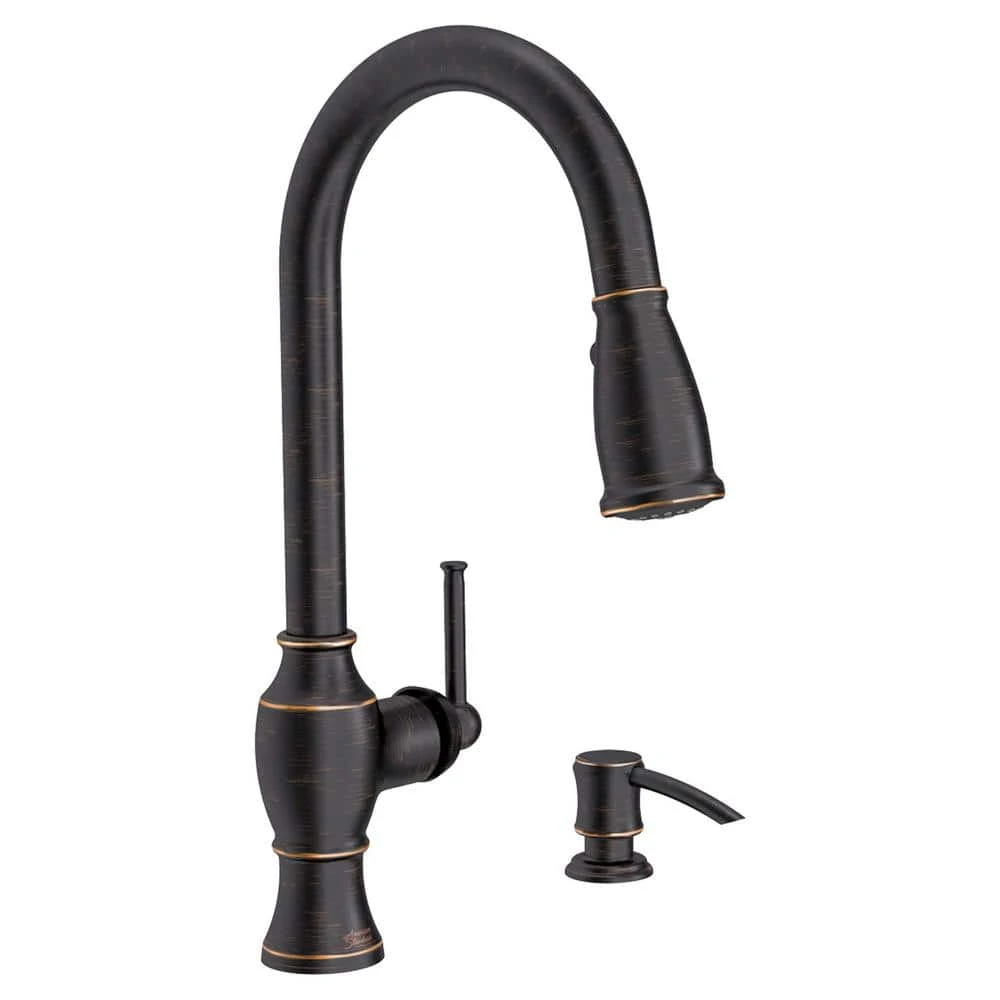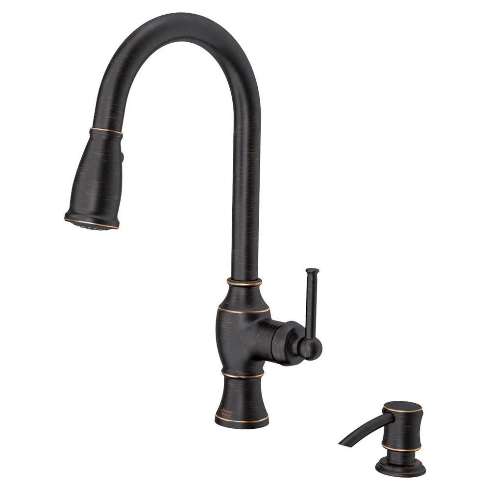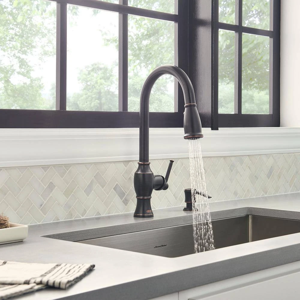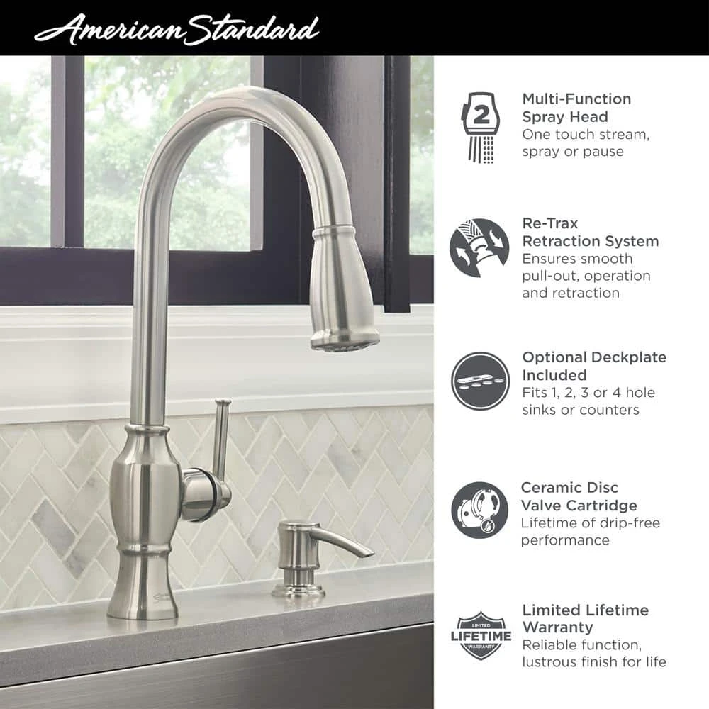 The Marchand Single-Handle Pull-Down Faucet from American Standard adds classic style and modern functionality to your kitchen. Recognized for durability and dependable performance, this high-arc swivel style is ideal for filling large pots and has a 3-function pull-down featuring stream, spray, and pause for maximum efficiency. Available in a variety of tarnish and scratch-resistant finishes.