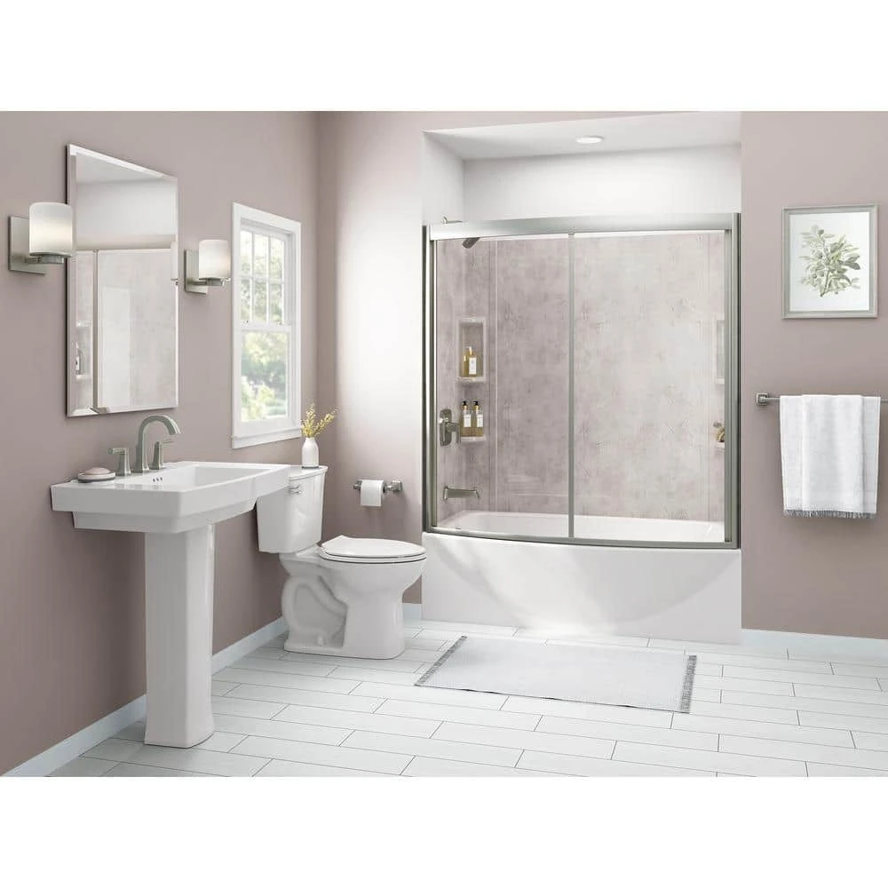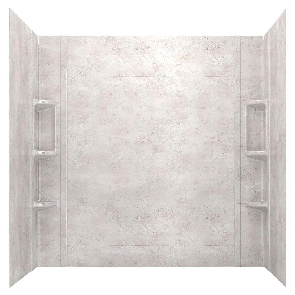 Freshen up your bathroom with the Ovation 5-Piece Glue-Up Alcove Wall Bath Set from Standard. Pre-measured and easy to trim for an exact fit, this high-gloss acrylic bath set adheres directly to green board. Corner units feature handy molded-in shelves to keep bathing essentials within reach.