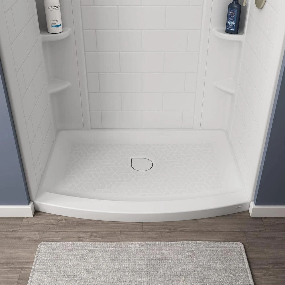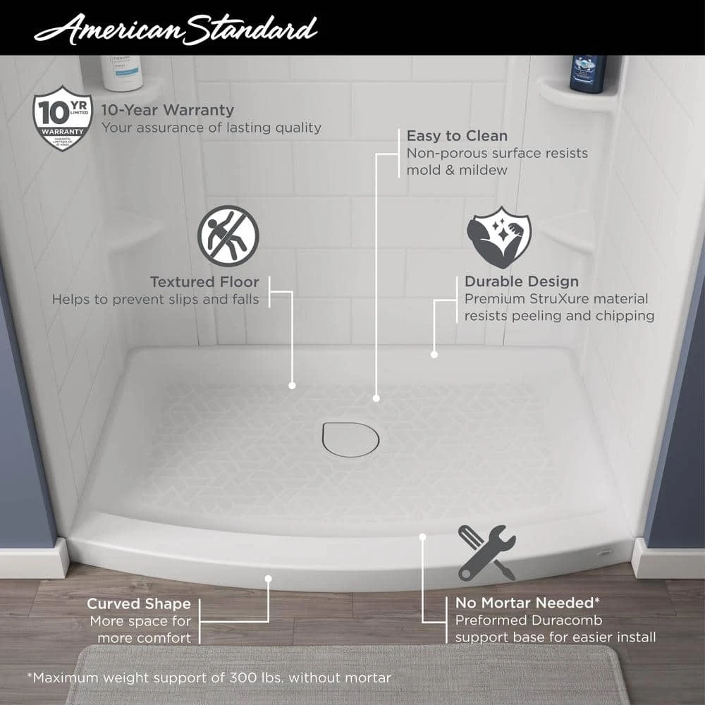 The Ovation Curve collection offers an easy and affordable way to transform your bathroom with a simple update or full makeover. Designed to make bathing more comfortable by adding more elbow room, the collection includes a curved bathtub, curved shower bases, curved doors, and a large subway tile patterned wall system, each sold separately. Whether your bathroom is large or small, choose the pieces you need to create a space you’ll love.Ovation Curve Shower Bases from American Standard are uniquely curved to create additional space for a more comfortable showering experience. Designed for safety, each base features a textured surface and low threshold to ensure no-slip confidence and easy entry and exit. Pair with the coordinating Ovation Curve curved barn-style door and wall surround, each sold separately, for a complete makeover.