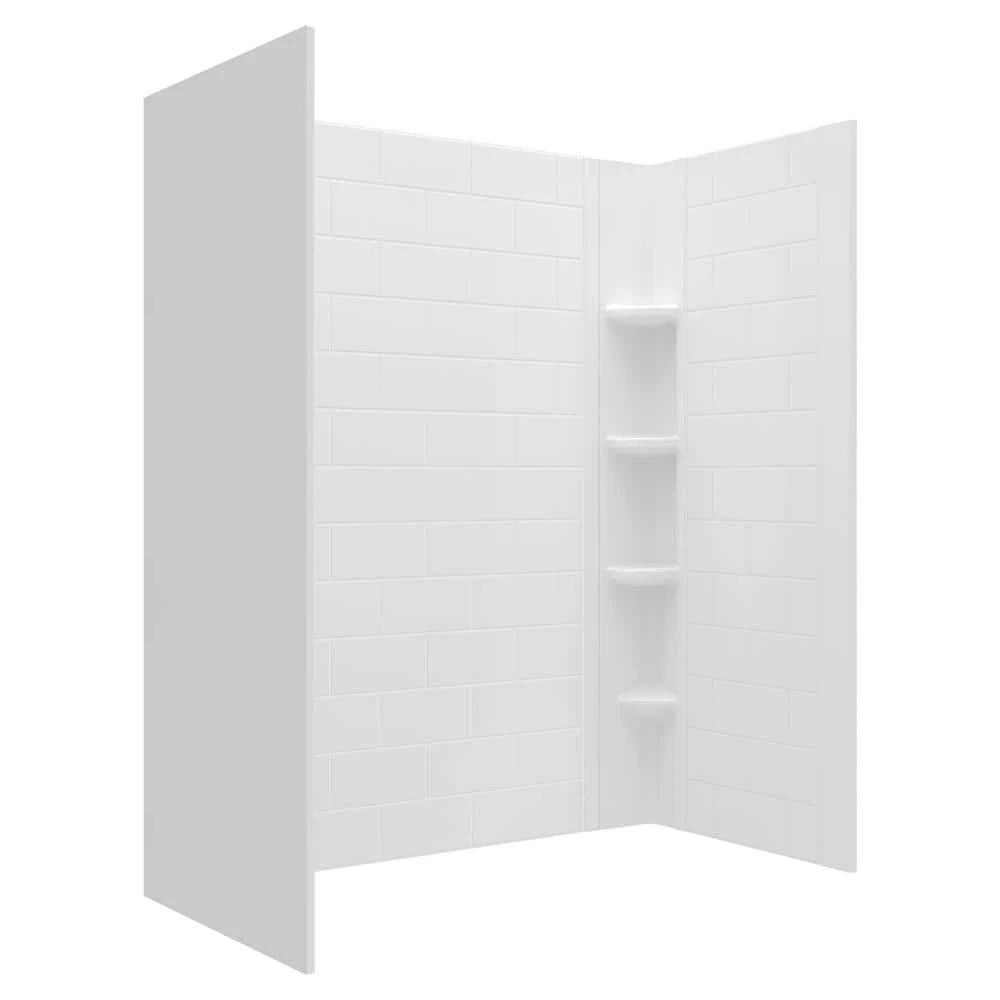 - 5-piece tile pattern wall system with built-in shelves features easy, glue-up installation and sized for easy handling