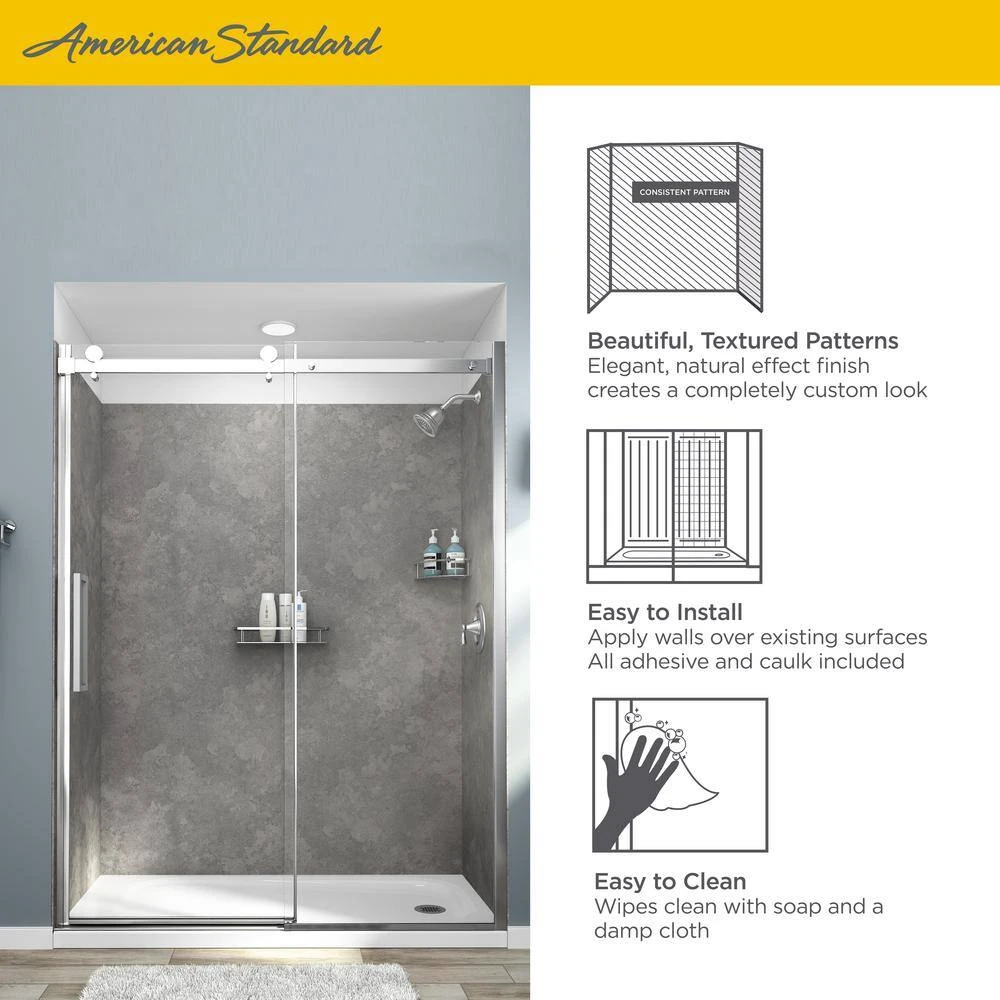 Give your bathroom a fresh update with the Passage Alcove Shower Wall system from American Standard. Decorative wall panels in todays most popular patterns are the perfect alternative to tile and grout. Easy to install, these durable, pre-cut panels adhere securely to waterproof wall-board for lasting beauty and wipe clean with ease.