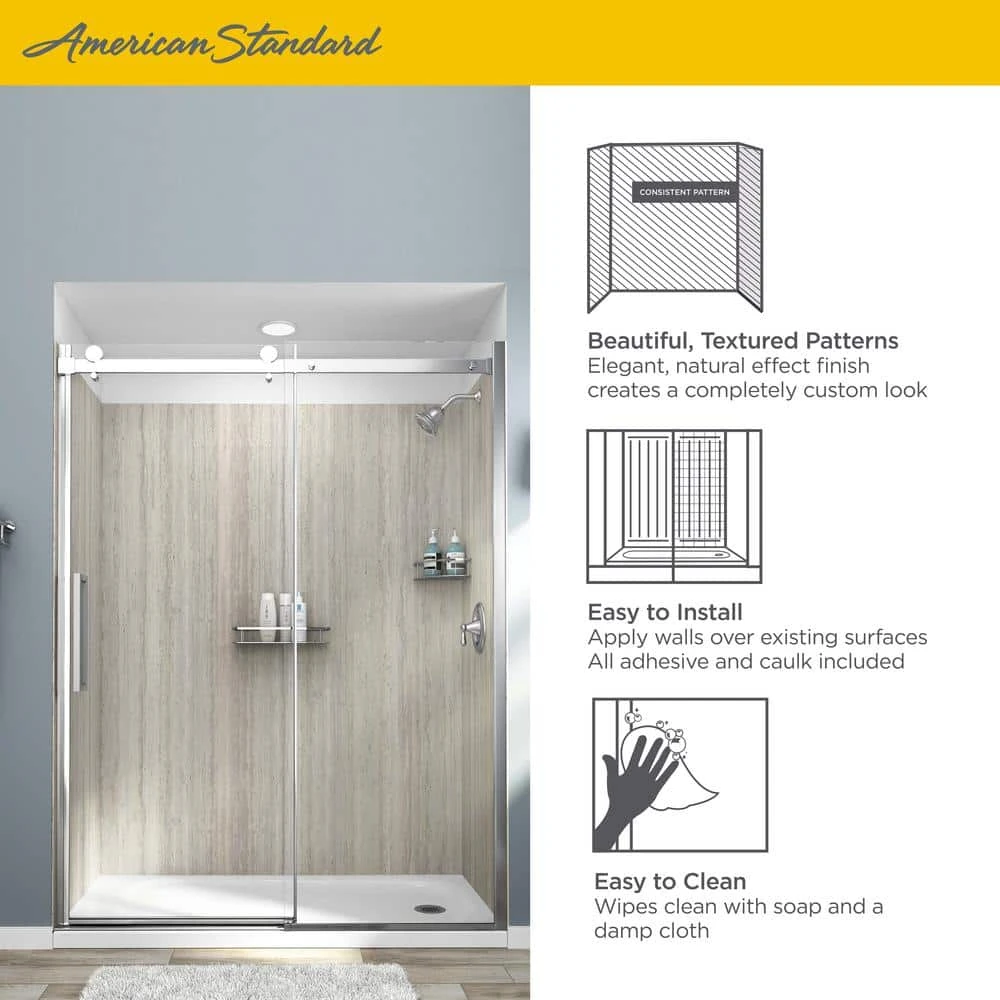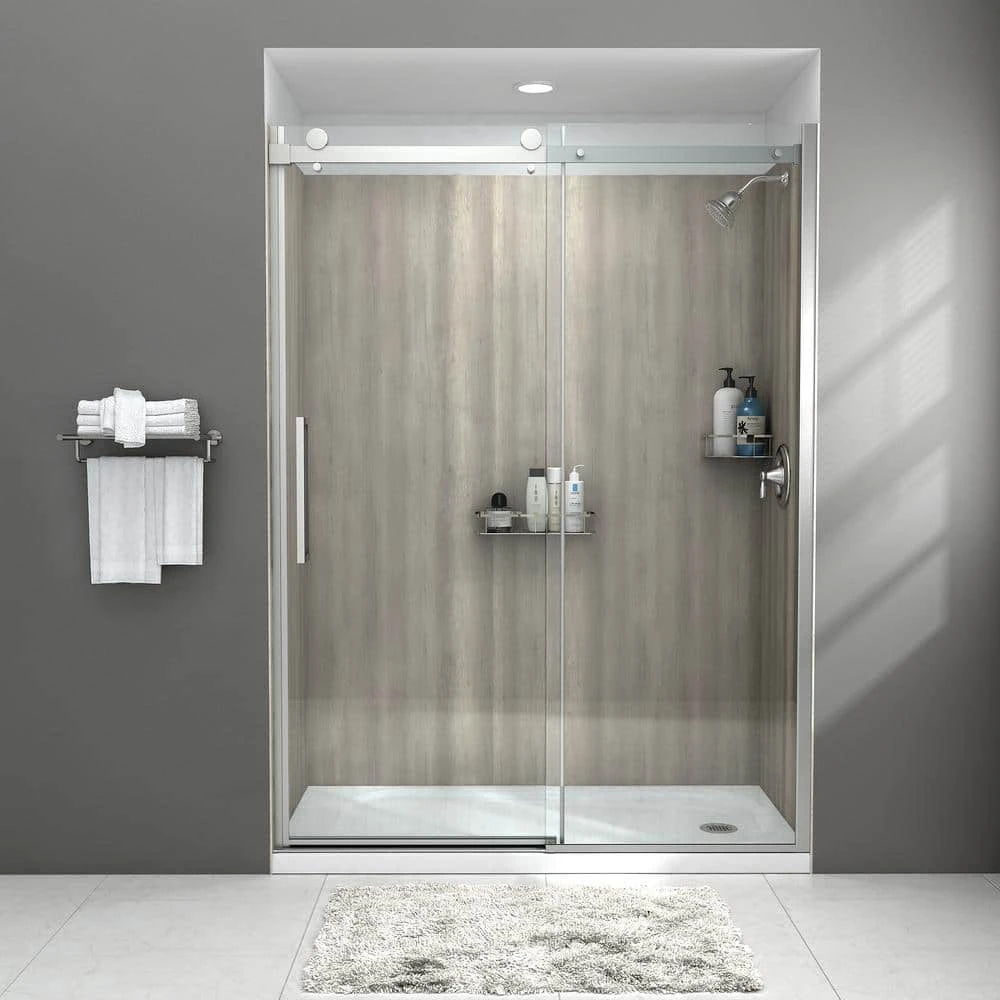 Take your bathroom from basic to beautiful with the Passage Custom Bathing System – a complete bathroom upgrade system with distinct textured wall, door and shower base. The decorative walls in five natural effect finishes provide the perfect alternative to tile. Passage walls are durable, easy to install and easy to keep clean. The Passage single, low-threshold shower base is durable, easy to clean, designed with dedicated storage space. With left drain outlet, this base is the perfect size to convert an existing 60 in. x 32 in. bathtub into a shower. The Passage frameless shower door features 3/8 in. thick, tempered glass and smooth-operating barn door rollers for a truly modern look; the perfect complement to showcase Passage Custom Shower Walls. The Easy-to-Clean glass sheets water to help prevent streaking.