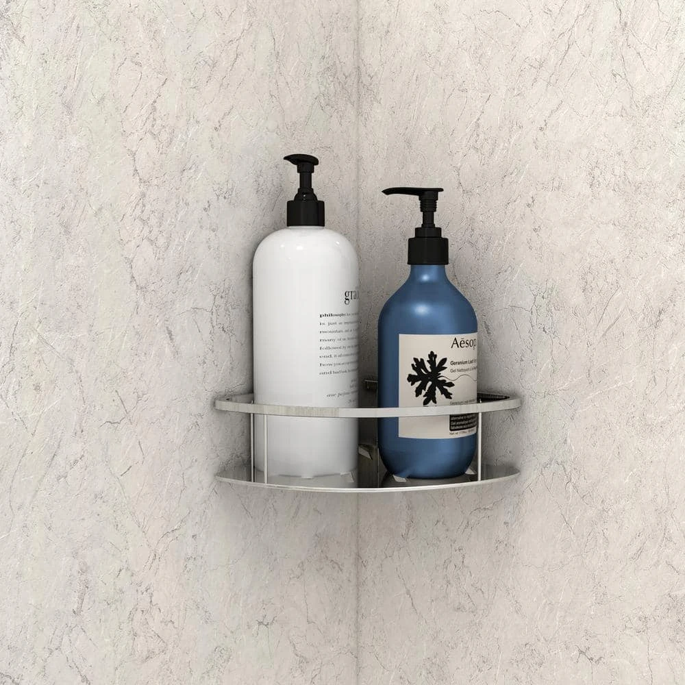 - Corner shelf comes in a beautiful brushed metal finish with hardware included