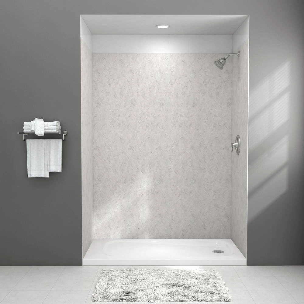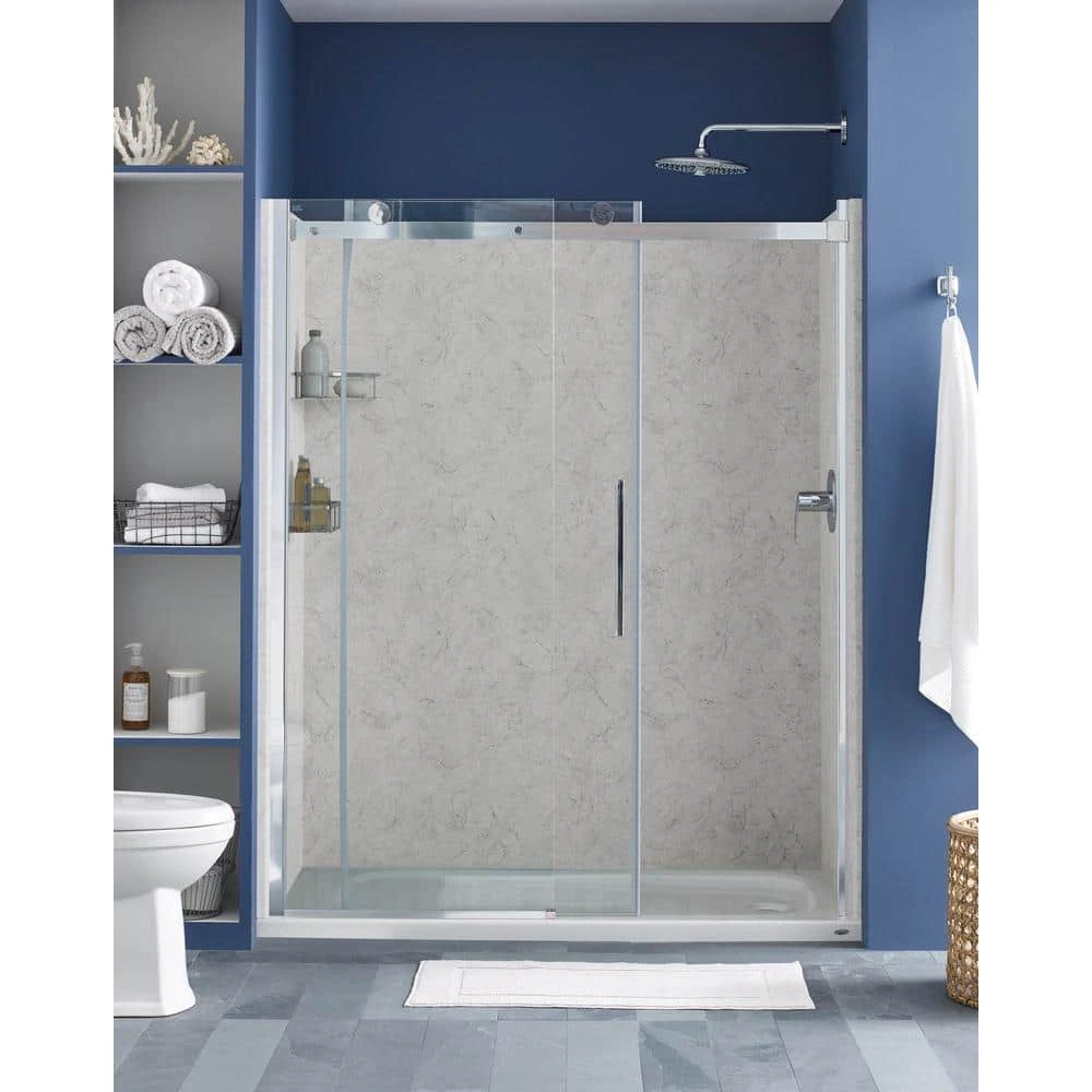 Give your bathroom a fresh update with the Passage Custom Shower Kit, complete with Platinum Marble 4-piece shower walls, corner shower shelf, shower base, and frameless shower doors. Easy to install, these durable, pre-cut panels adhere securely to Greenboard with waterproof adhesive and feature beautiful, natural finishes for a realistic tile look without the mess of grout. The Passage single, low-threshold shower base is durable and easy to clean, and the perfect size to convert an existing 60 in. x 32 in. bathtub into a shower. To complete your shower base and walls, the Passage frameless shower door features Easy-to-Clean glass to help prevent streaking, and smooth-operating barn door rollers for a truly modern look. A convenient brushed metal corner shelf is included for all of your shower essentials.