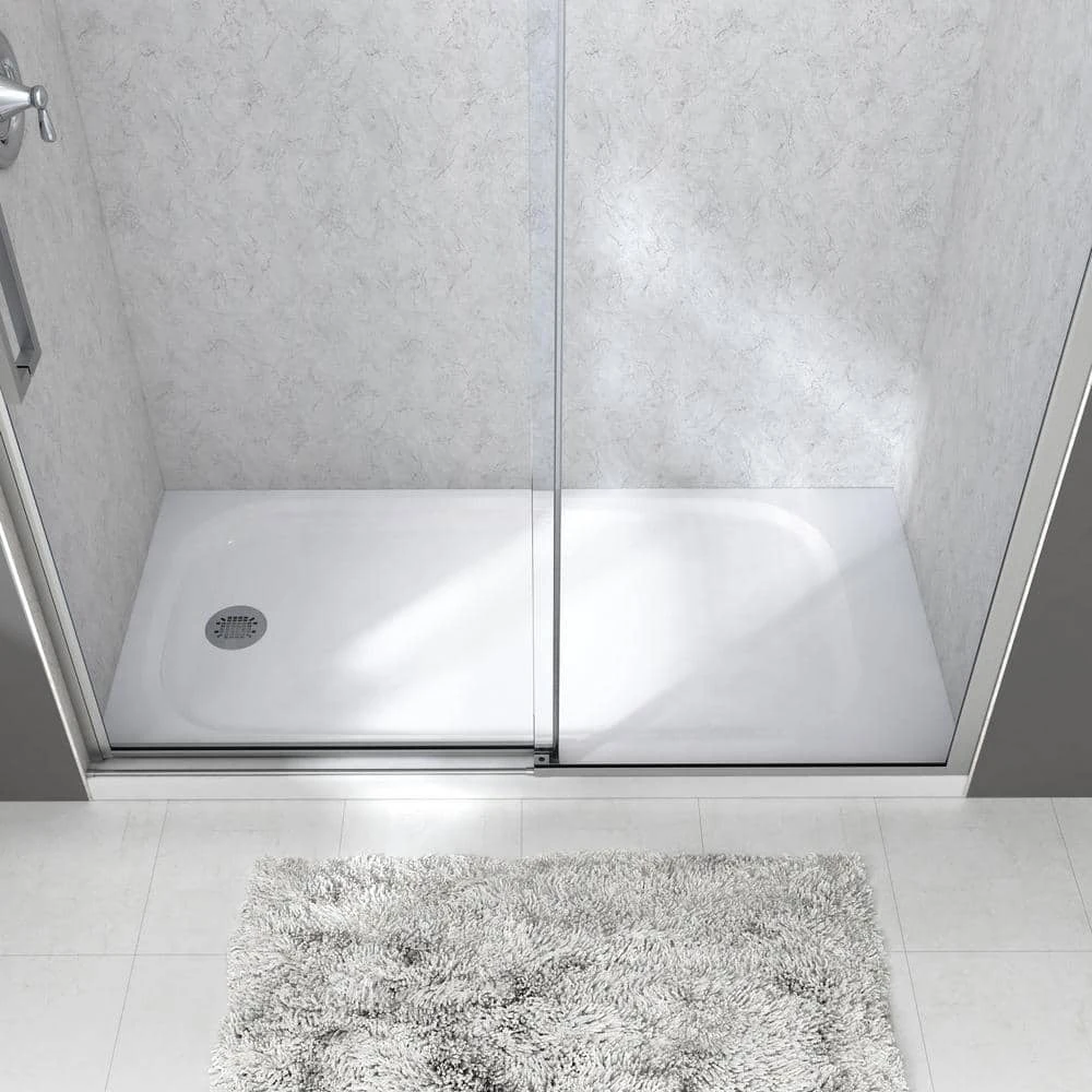 The Passage single, low-threshold shower base is durable, easy to clean, designed with dedicated storage space. A unique and enticing geometric shape looks chic in any bathroom, and a textured floor helps to prevent slips and falls. The left drain design is the perfect size to convert an existing 60 in. x 32 in. bathtub into a shower. Features: Durable acrylic with fiberglass reinforced construction Low 2-1/4 in. threshold height Unique and pleasing geometric shape Deck platform creates distinct showering and storage spaces Integral three-sided, tiling/water retention flange End drain outlet Textured floor helps prevent slips and falls Shower drain not included Limited Lifetime warranty.