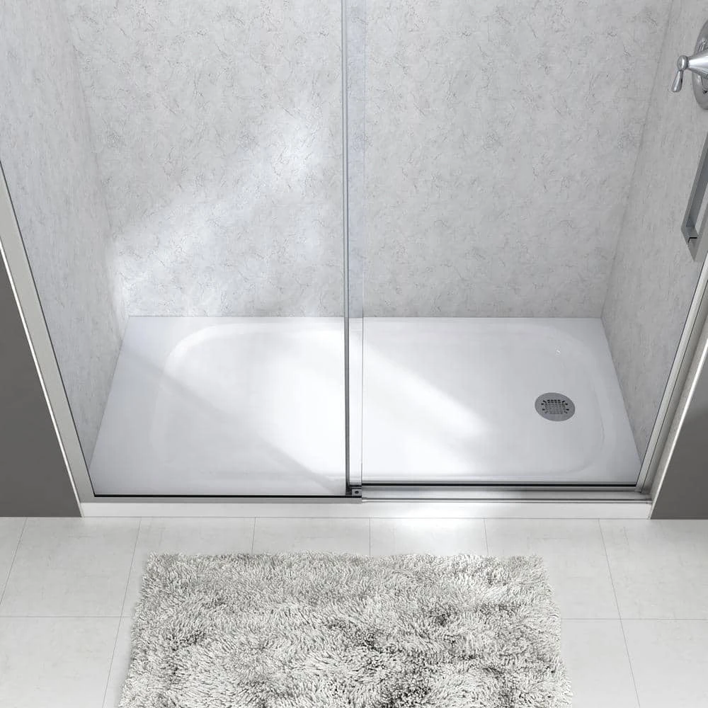 The Passage single, low-threshold shower base is durable, easy to clean, designed with dedicated storage space. The right drain design is the perfect size to convert an existing 60 in. x 32 in. bathtub into a shower. A textured floor helps to prevent against slips and falls. Features: Durable acrylic with fiberglass reinforced construction Low 2-1/4 in. threshold height Unique and pleasing geometric shape Deck platform creates distinct showering and storage spaces Integral three-sided, tiling/water retention flange End drain outlet Textured floor helps prevent slips and falls Shower drain not included Limited Lifetime warranty.