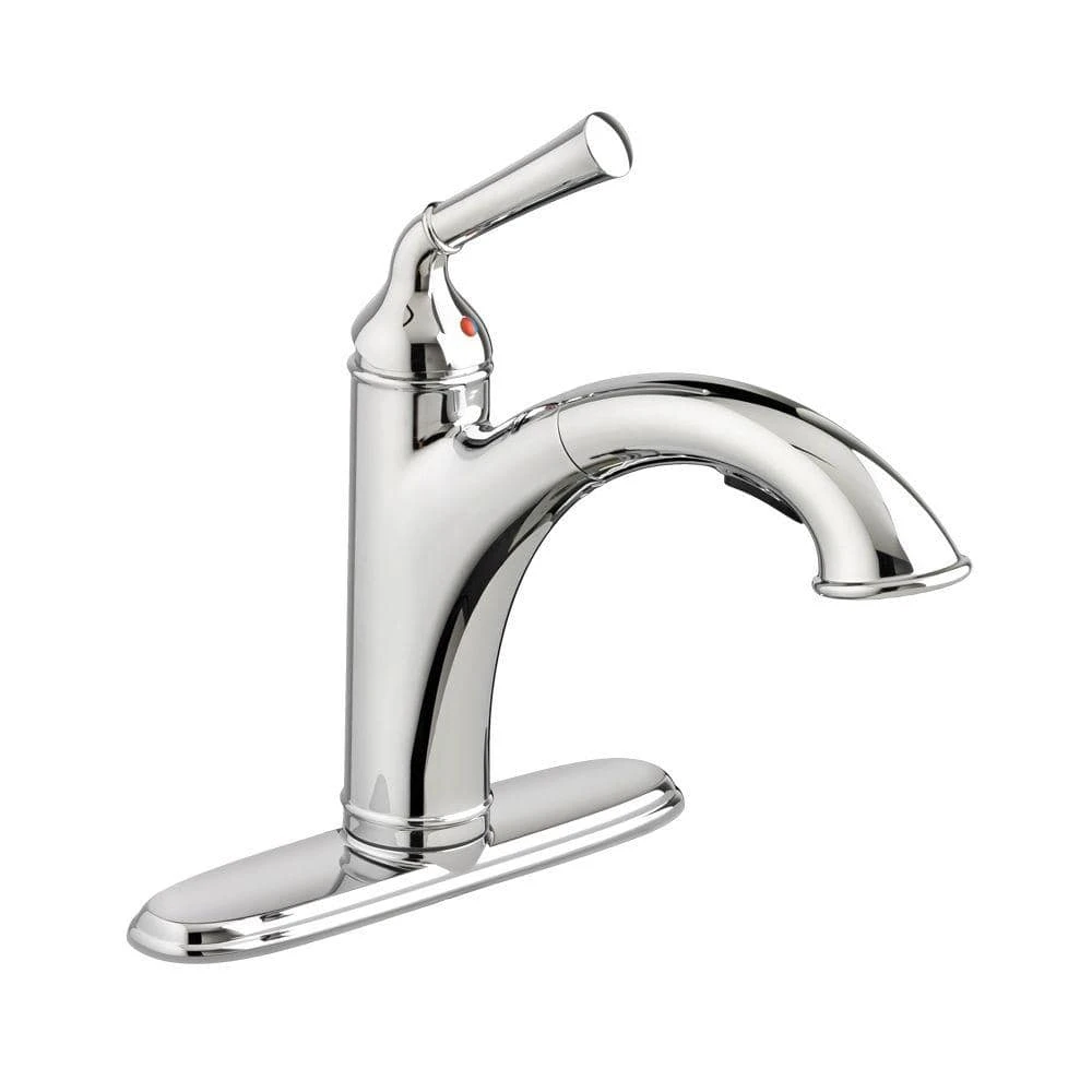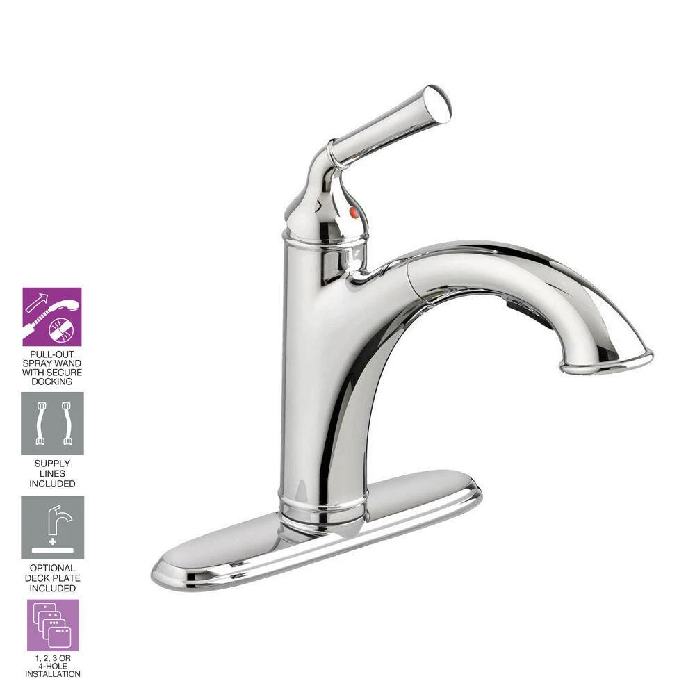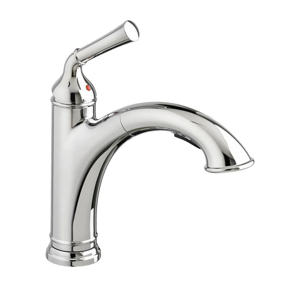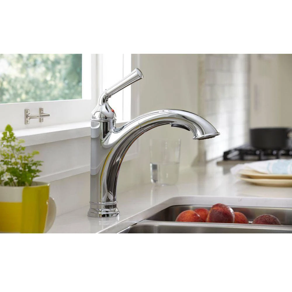 Turn on the turn-of-the-century charm. This single-handle pull out faucet from our Portsmouth Kitchen Faucet Collection features iconic sculpted details that are ideal for traditional kitchens. Modern touches include a pull-out 2-function spray, sturdy metal construction, brass swivel spout and drip-free ceramic disc valves.