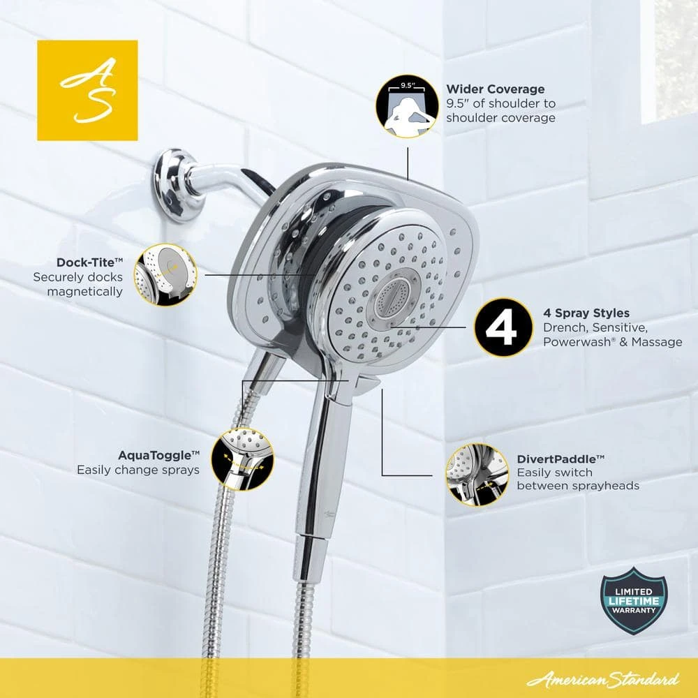 Experience a combination of great innovation and design with the Spectra+ Duo 4-Function 2-in-1 shower head from American Standard. With its wide design, you’ll have more water coverage with the option to remove the center as a hand shower that makes cleaning the shower, bathing the kids, or washing the dog easier than ever before. The Spectra+ Duo brings customization to your shower with 4 separate spray patterns Drench, Sensitive, Powerwash, and Massage.