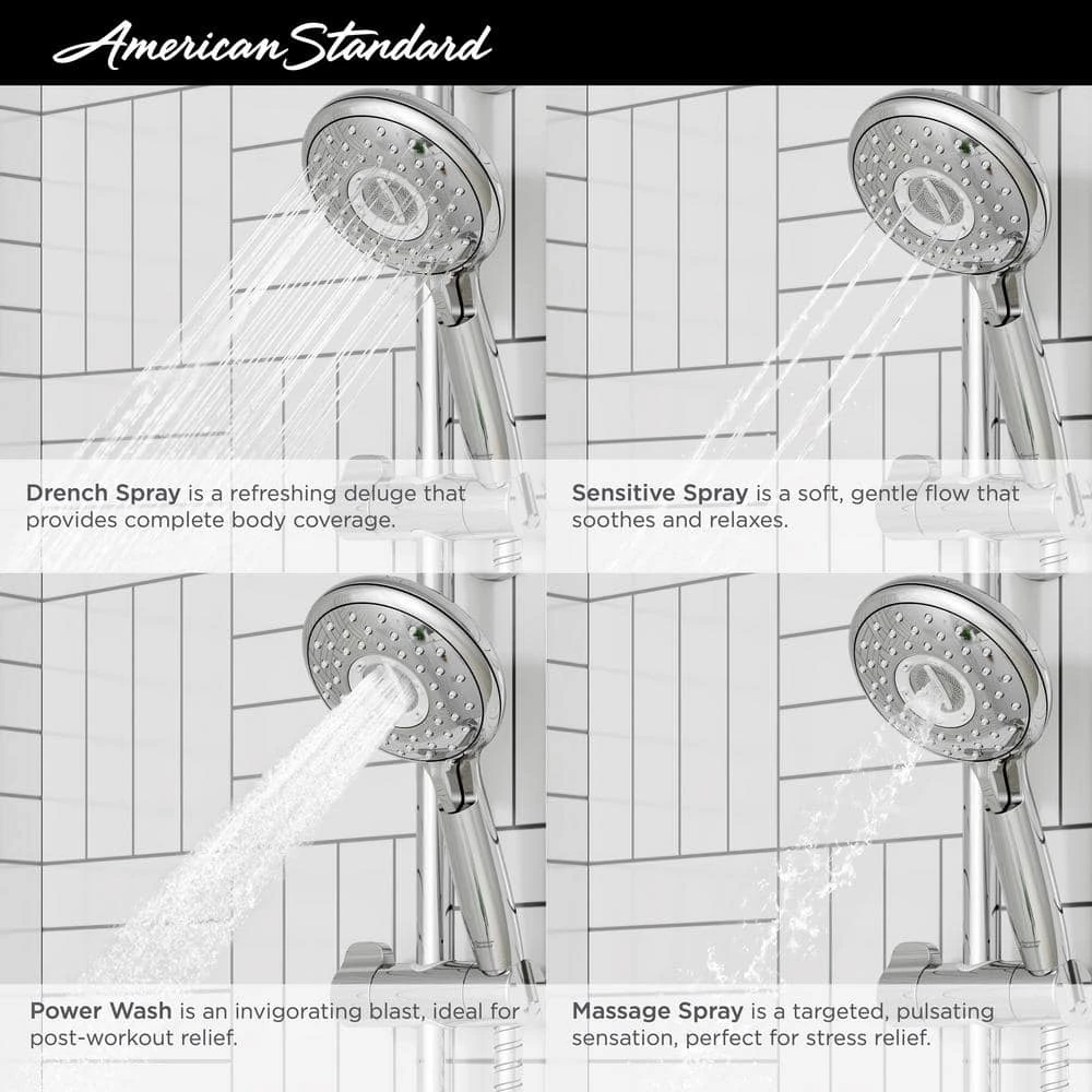 - Hand shower features 4-spray functions: drench, full body coverage, sensitive, soft, gentle spray, power wash, invigorating spray, massage, pulsating spray