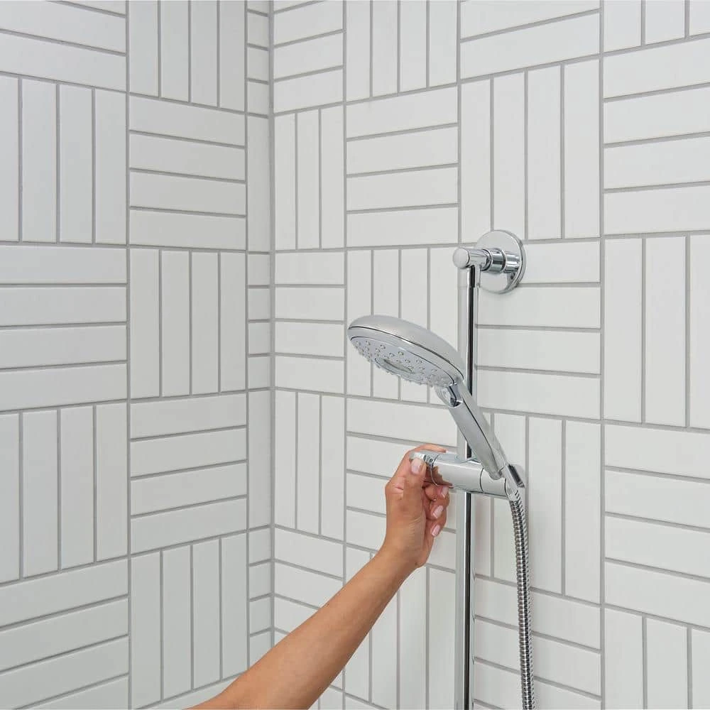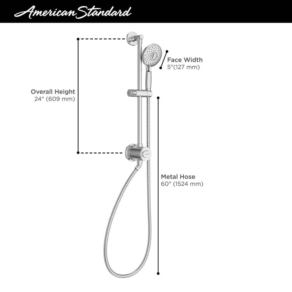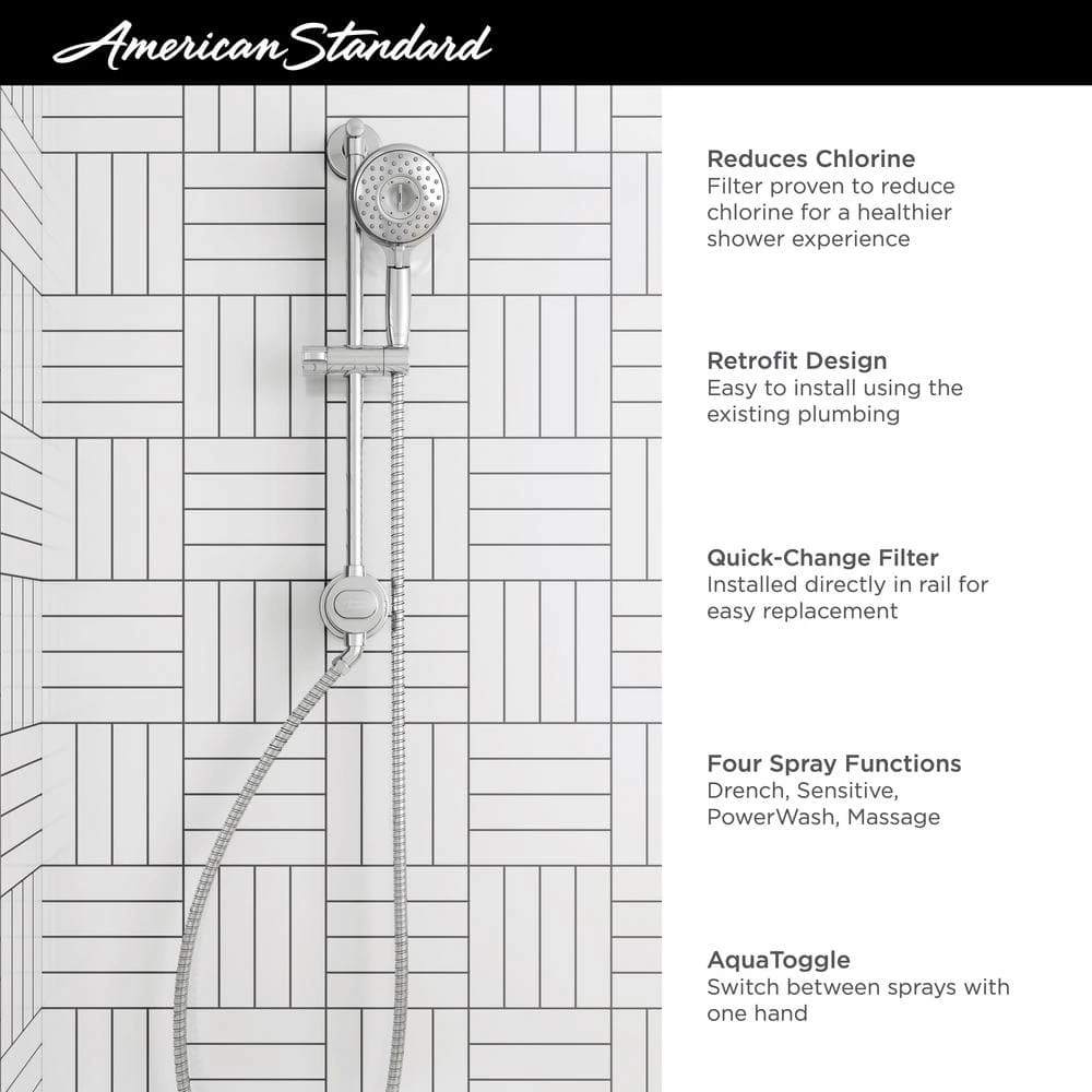 As a leader in providing solutions for better living and increased well-being, American Standard developed the spectra filtered 4-spray hand shower rail system. Chlorine in your shower water can dry out your skin and damage your hair. The spectra filtered system helps keep your skin and hair healthy by reducing up to 50% of chlorine in your shower water for a more enjoyable showering experience. Built into the sleek rail system, the filter is easy to change and eliminates the need for a bulky add-on filter. The spectra hand shower features 4-spray functions, from a drenching rain to a pulsating massage and is mounted on an adjustable, smooth-gliding holder ensuring a comfortable height and angle for everyone. This sleek, filtered shower system is easy to install using your existing shower valve and plumbing for a quick bathroom update that is both beneficial and beautiful. Based on NSF 177 standard.