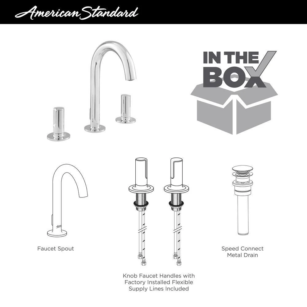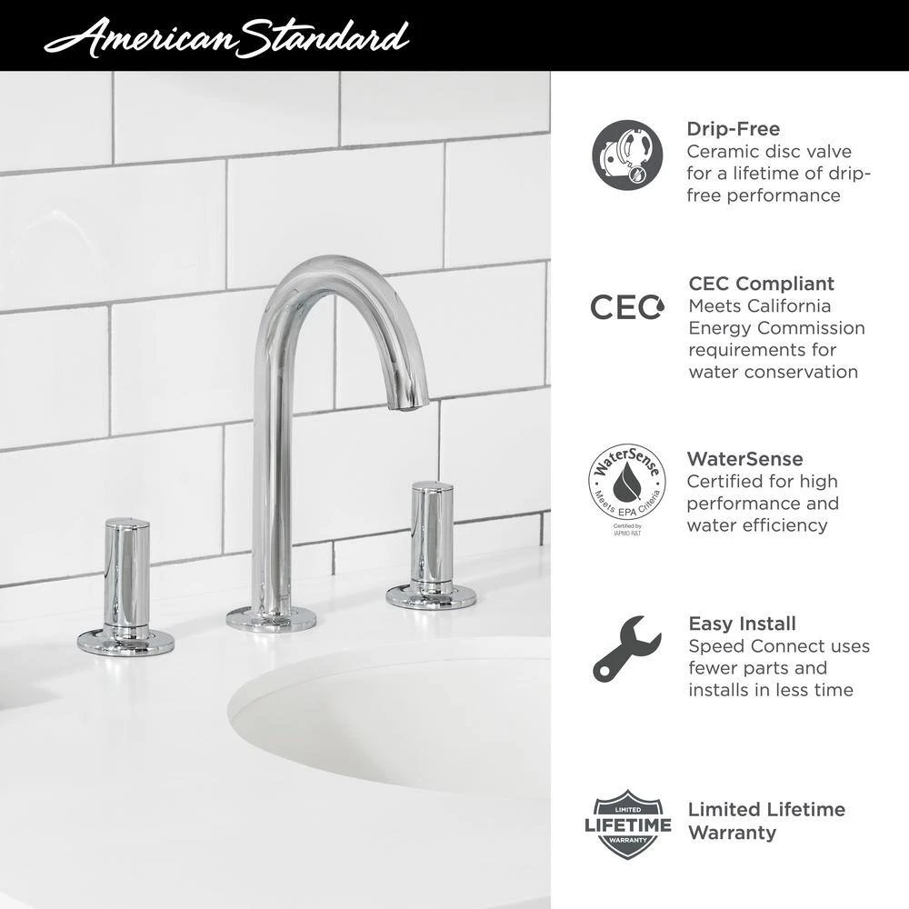 The sleek geometric design and soft edges of the Studio S Widespread Bathroom Faucet provides a metropolitan update for modern bathrooms. Engineered with ceramic disc valves, the handles operate smoothly with drip-free performance. The WaterSense certified faucet provides up to 32% water-savings when compared to standard faucets and is CEC listed.