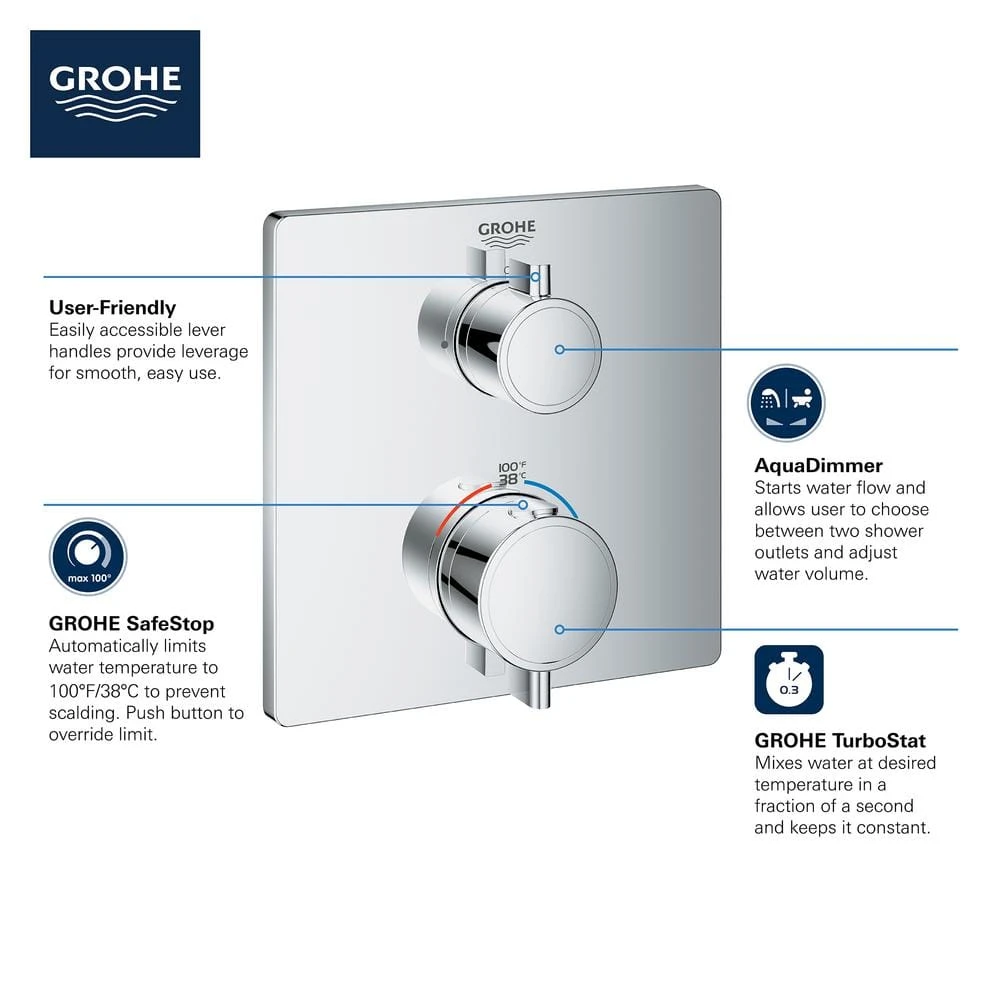 - Adjustable hot limit safety stops: limits the amount of hot water allowed to mix with cold, reduces the risk of accidental scalding